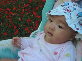 这两张照片是用新买的佳能A40相机拍摄。由于屋子里的光线已经不足,老公带着宝宝到楼下的花园中搞“创作”。上来后就有了这两张照片。上面这张照片我觉得堪称经典,当宝宝安静的时候,真的很有韵味。而且宝宝的气色看上去很好,粉粉嫩嫩的。