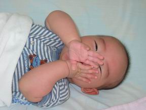 宝宝还没有洗脸,不许拍照。对形象很注意的宝宝看到镜头,赶紧用手遮住脸。
