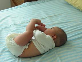 4个多月的宝宝开始对自己的脚丫子感兴趣。开始是由于不愿意老老实实靠在安全小坐椅中,宝宝总想坐起来。坐又坐不住,身子一会就整个压在了腿上。于是宝宝忽然发现了身子底下还有一个比手指更肥厚的可以吃的新玩意。