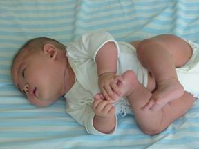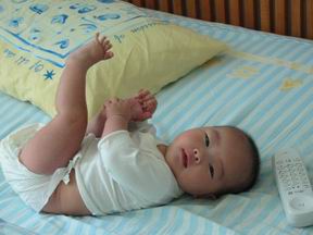 宝宝的脚丫子已经不象刚刚出生时的样子,慢慢长长长大了,脚指头也伸展开,不总是那么勾着了。不过宝宝的脚指头可灵活着呢,当宝宝把几个指头放到嘴里咬的时候,小脚指头会很配合的一屈一伸,便于宝宝多方位的动感品尝。如果你把她的脚脚搁到宝宝的小脸上,脚指头就会一动一动的,作什么呢?抚摩宝宝的小脸呢!