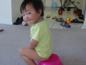 丫丫的小屁股下面是爸爸花大价钱买的超级豪华小马桶的部分,这是为了让已经快一岁半的丫丫开始学习自我解决排泄的大问题而买的。为了这个马桶都去了商场好几次,又是图案又是音乐又是会发光的选的都花了眼,最后决定就是这个有软软坐垫的舒适马桶了。没想到丫丫死活不领情,在被我狠心摁倒在马桶上一次后,丫丫原本大便前的通知愣是被我吓了回去。从此,丫丫又开始了悄没声息的大便,等我闻到臭臭就吓的赶紧和我说BYE-BYE。只好让她慢慢和马桶培养感情,没想到培养到最后,丫丫可以把马桶外面的圈圈套进脑袋里,可以把小便盆整个罩在脸上还试图用舌头尝尝味道,也可以这样倒扣着坐在屁股下面,但你就是别想让她规规矩矩的坐在马桶上了。哎,彻底的失败啊!