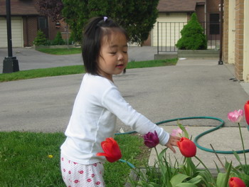 隔壁邻居的花坛,很漂亮的郁金香。不过可经不起丫丫的摧花手,随手一拨拉,一朵花眨眼就秃了。弄的我心惊肉跳的总怕丫丫动手动脚。