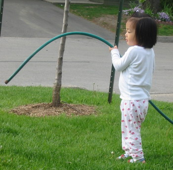 玩草地上的浇花管子也是丫丫的最爱,她会拖来拖去的装模做样的浇浇花,浇浇树,偶尔没注意她,还会放到嘴里洗洗牙。